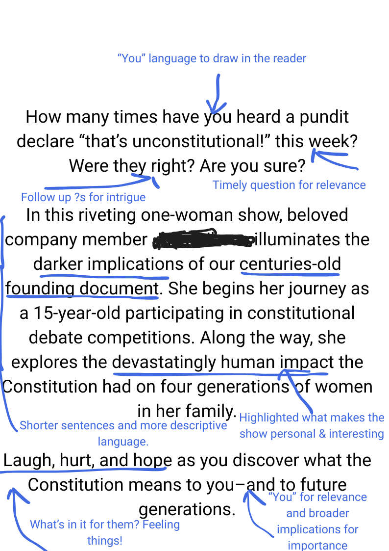 Tips for writing promo postcards that convert I’m a theatre person (yup, the kind that uses the -re ending. Guilty.). I was an actor in New York after college… (Here I am doing a little Off-Off-Broadway theatre.) …and my first fundraising job was with a community theatre. Even though acting was two careers ago, theatre is still near and dear to my heart. So when I saw a show promo postcard underselling an incredible play, the writer and the theatre nerd in me couldn’t help but give it a...